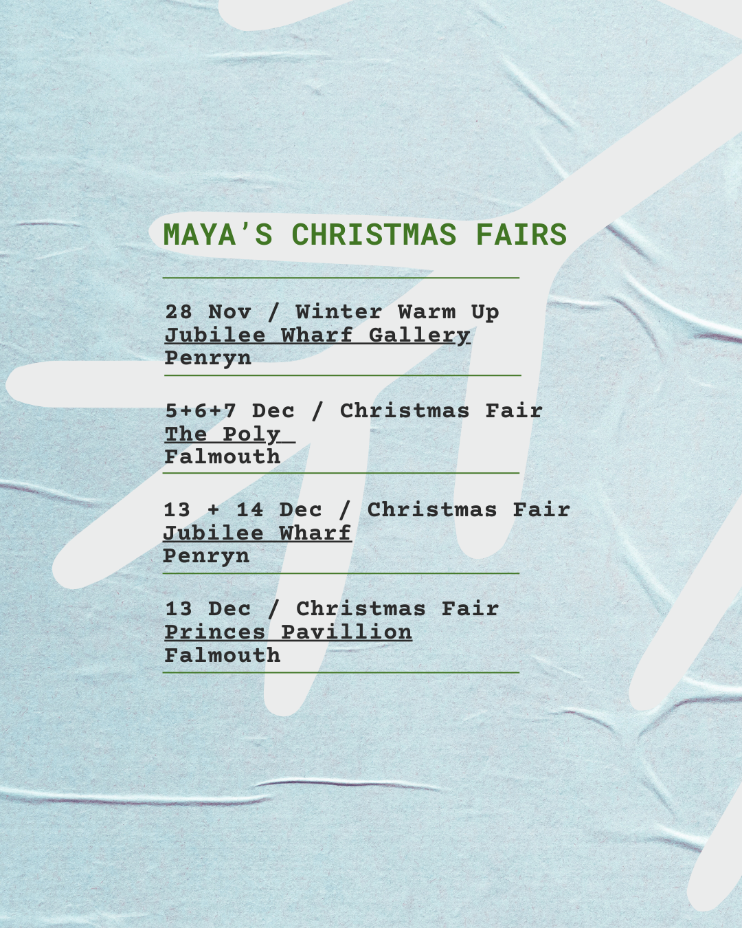 Come and visit Maya at these charming Christmas fairs around Cornwall this December 🎄 For more info click each link: