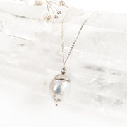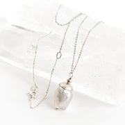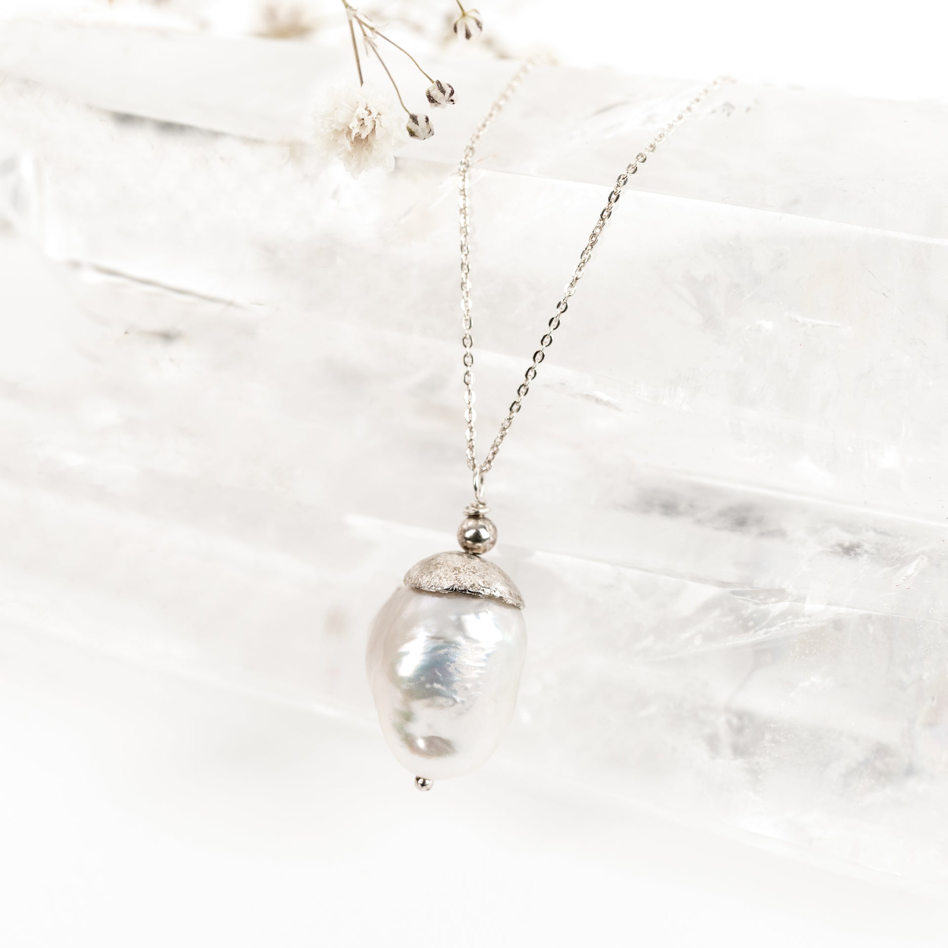 Baroque pearl in a reticulated silver cup on an adjustable silver chain. The pearl is large in size and of high quality. It is white in colour with beautiful shimmering lustre. An elegant piece of jewellery that can be worn for everyday or for a special occasion.